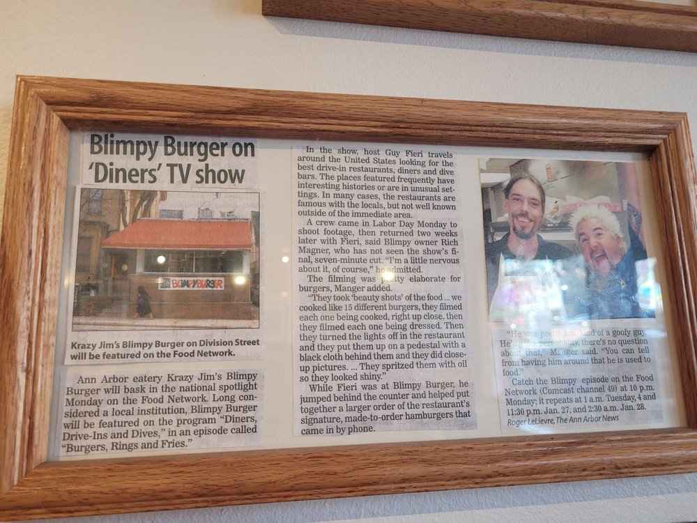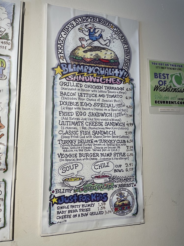Krazy Jim's Blimpy Burger is a renowned burger joint in Ann Arbor, MI, known for its unique menu offerings and casual atmosphere. The restaurant offers a variety of burger options, including the Double Burger and Double Cheese Burger, as well as sandwiches like the Grilled Chicken Tarragon Marinated On Kaiser and the Veggie Burger Blimpy Style. Desserts like Brownies and Big Cookies are also available to satisfy your sweet tooth.